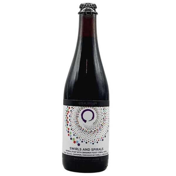 Swirls and Spirals pours viscous with aromas of French toast, maple custard, and your favorite bake shop. The flavors work so well together offering notes of chocolate pudding, cinnamon coffee cake, sticky brown sugar, pecan sandies, and the perfect amount of vanilla frosting. This beer is like liquid gooey cake and packed with flavors that end with delicate and balanced wisps of cinnamon goodness. Swirls and Spirals is a breakfast casserole in a bottle